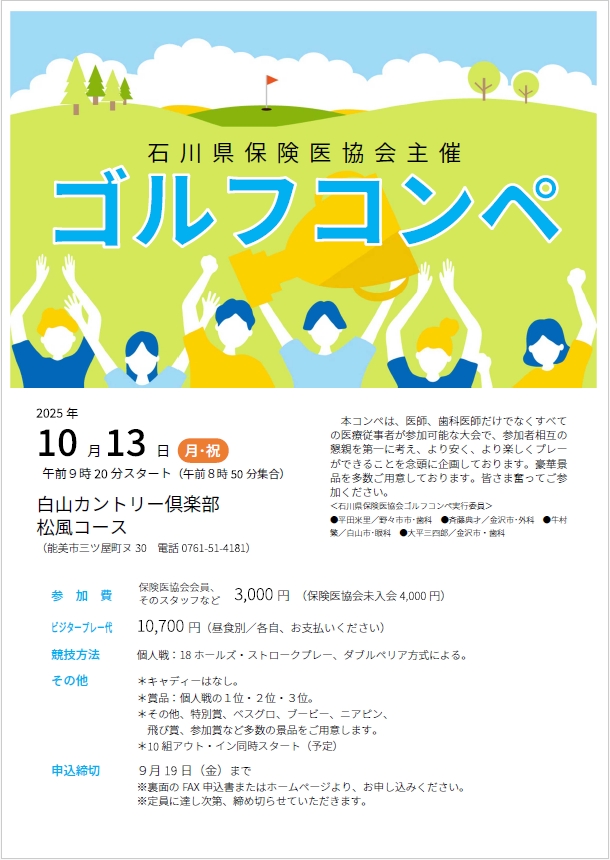 ゴルフコンペ2025 2025年5月1日 partner 日時 2025年10月13日(月・祝)午前9時13分スタート(午前8時50分集合)場所 白山カントリー倶楽部 松風コース参加費 保険医協会会員並びにそのスタッフなど 3,000円 保険医協会未入会員 4,000円ビジタープレー代 10,700円(昼食別/各自、お支払いください)